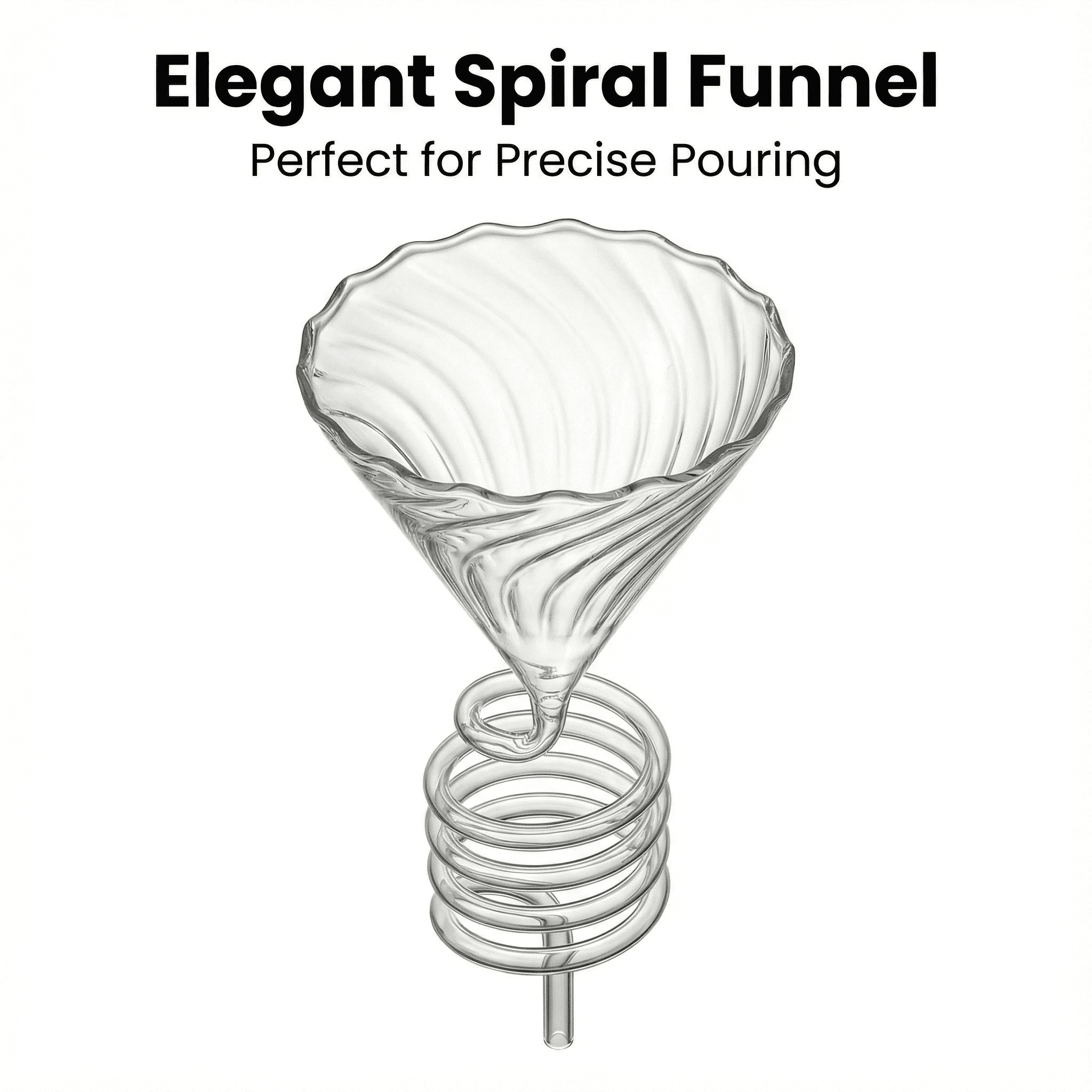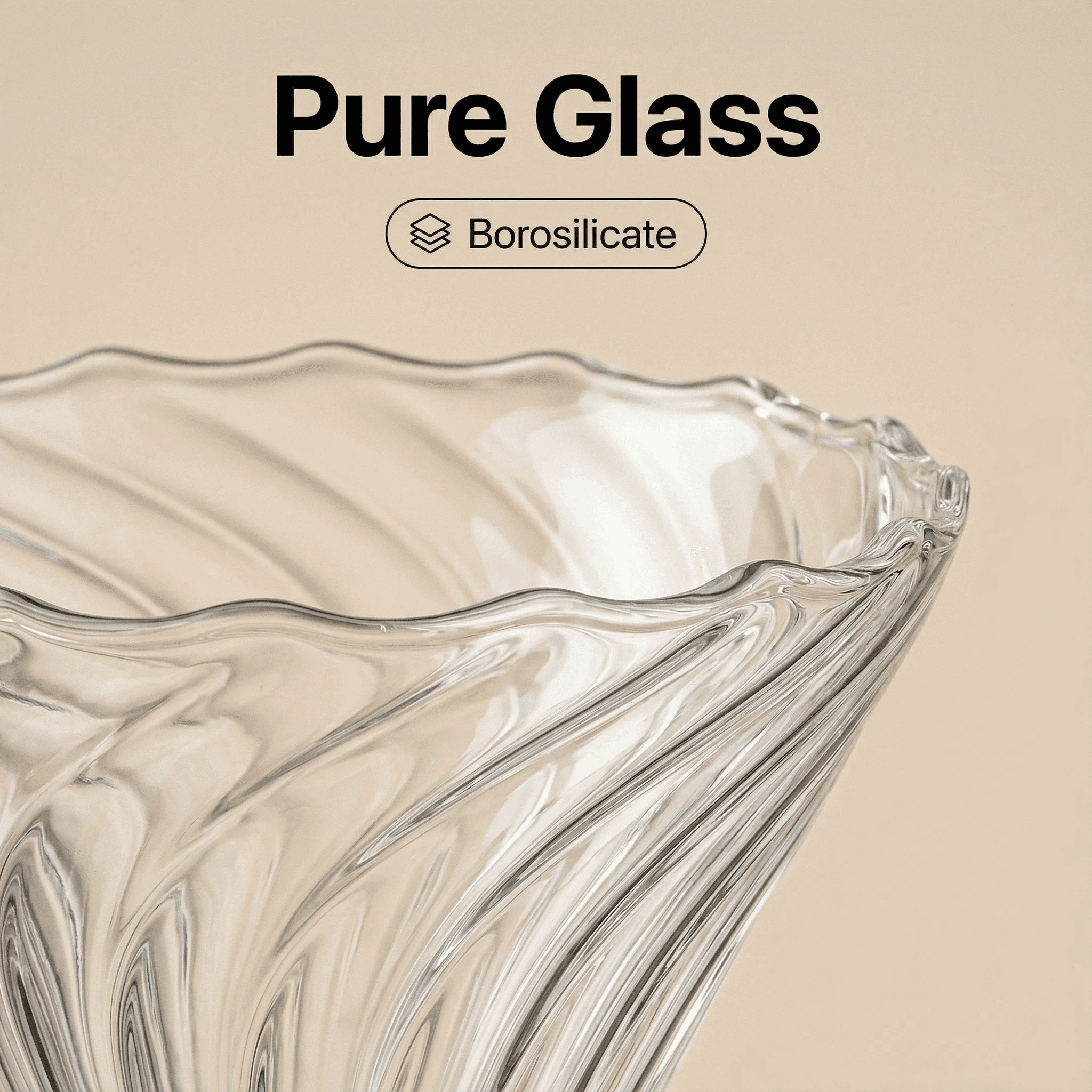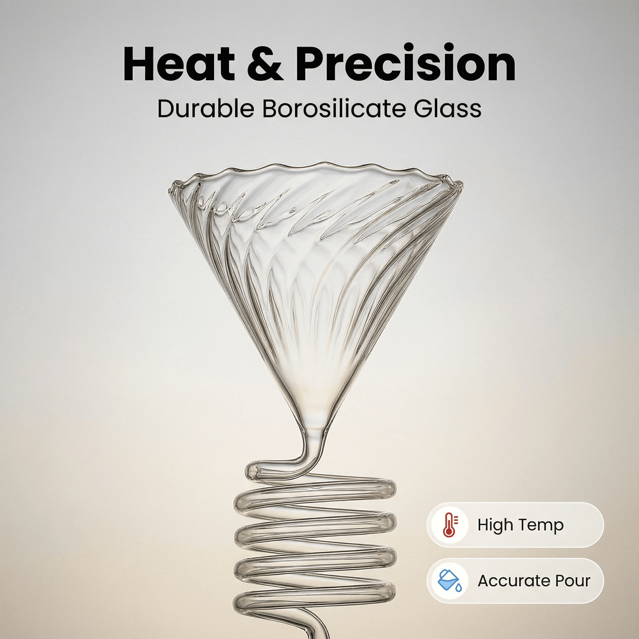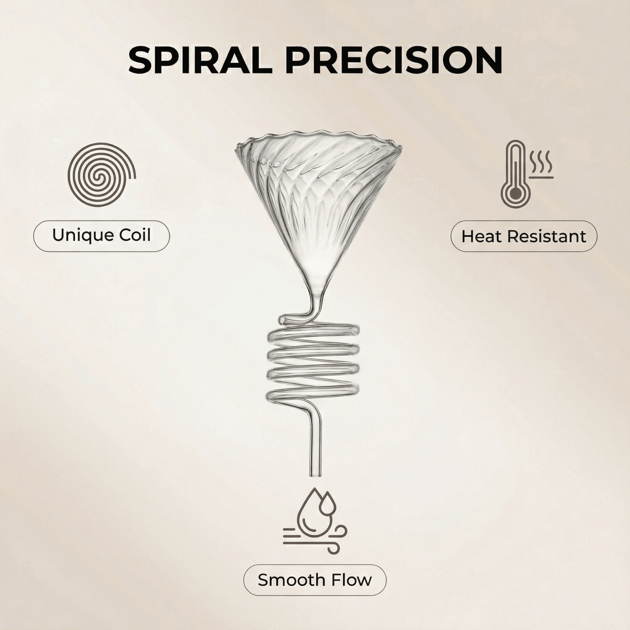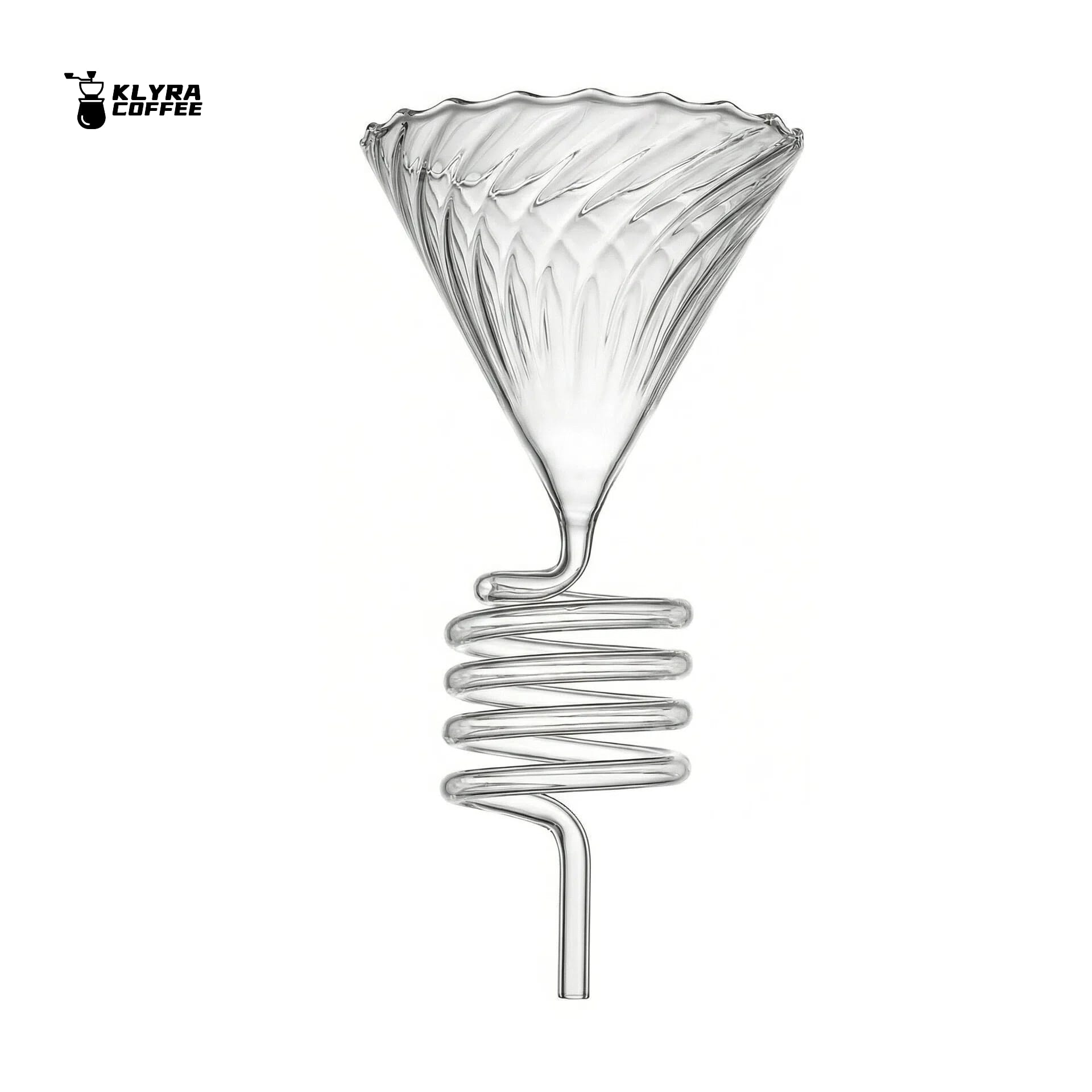 This spiral glass coffee dripper features a vortex-style channel that guides water flow evenly through your coffee bed.
